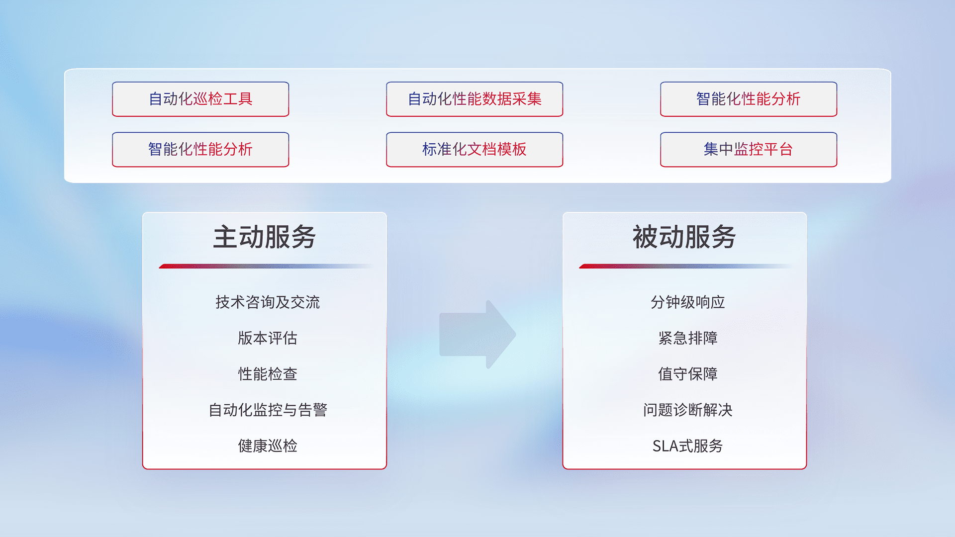 智能化工具和标准化文档,,保障服务质量,,,,提供主动服务(包含技术咨询、、、、版本评估、、、、性能检查、、自动化监控与告警、、、健康巡检)和被动服务包含(分钟级响应、、、、紧急排障、、、、值守保障、、、、问题诊断解决、、、、SLA服务)。。